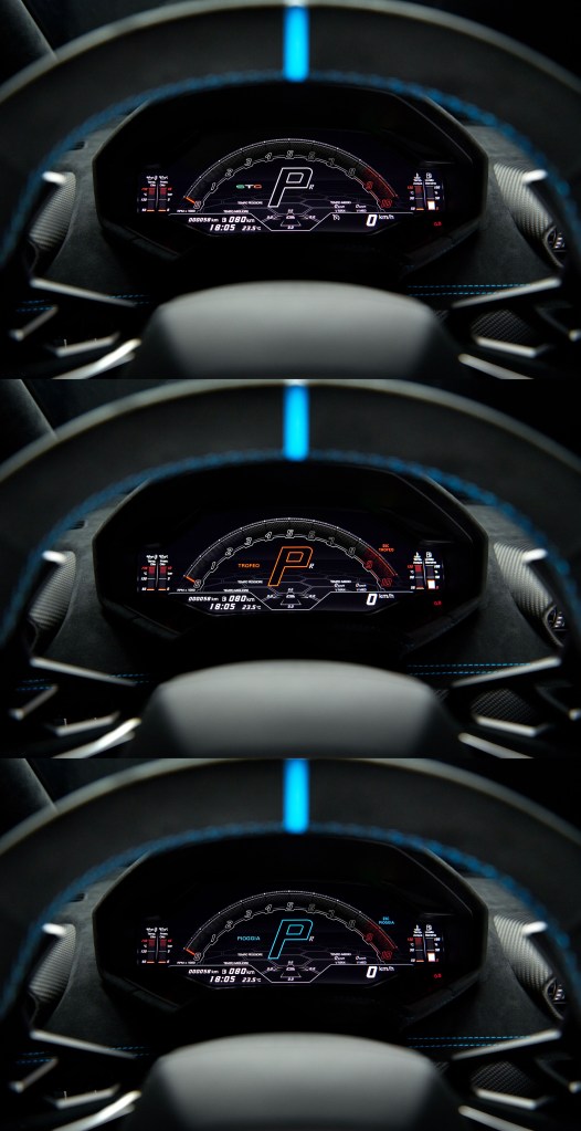 Since the STO is a road car, it’s worth discussing the interior too. Its cabin has a lot of carbon fibre, including the sport seats and floor mats. There is also Alcantara upholstery, four-point seatbelt harnesses and a trunk for helmet storage only. While it’s not the car for a weekend road trip, you could make a day trip to the track. It has the usual digital driver’s display along with a large touchscreen infotainment unit in the central console that can also control car functions. Mostly, it allows you to check the LDVI system, the tire and brake temperatures, and use the connected telemetry system to monitor and record your performance at various race tracks. The Anima selector is located on the bottom of the steering wheel as usual.