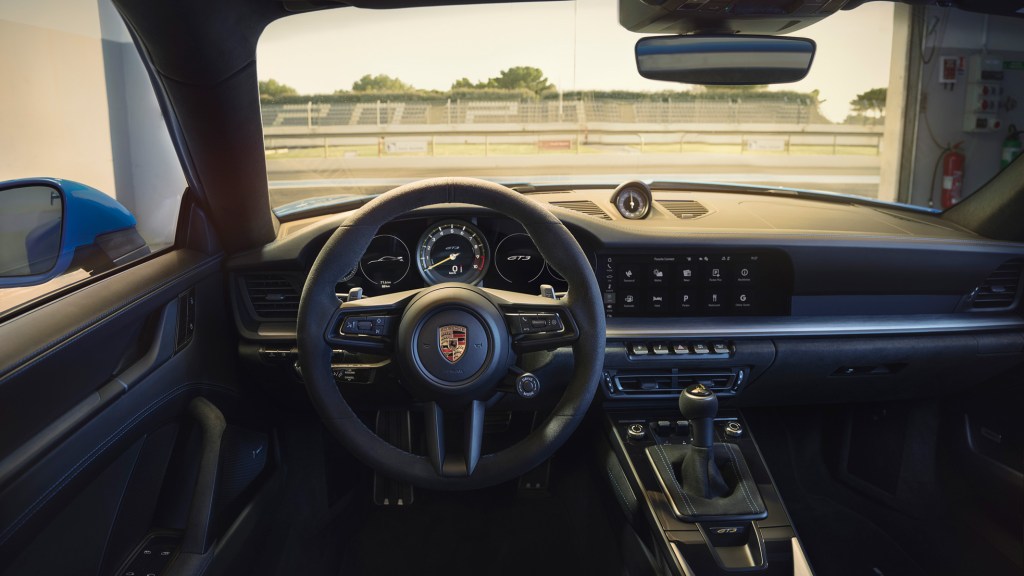 The new GT3 gets pretty much the same cabin as the standard 992-gen 911. Digital screens are flanking the cental analogue rev counter which also has a small digital readout in the middle. Since it offers the same 7-speed PDK as the previous GT3, it has a proper gear shifter in the centre that looks a lot like the manual gear selector. You can slot it to the left into manual mode and even use it as a sequential shifter if the paddle shifters aren’t cool enough. This small detail offers huge relief since the other 992 models with their 8-speed PDK transmission get the new toggle-like drive selector.