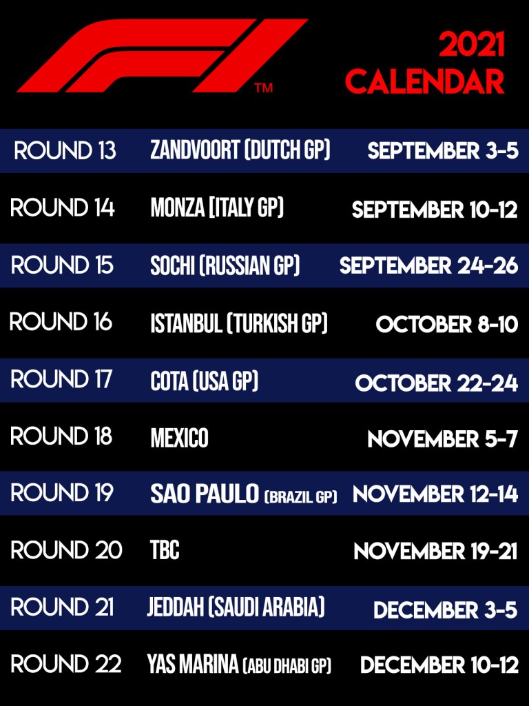 Here’s how the rest of the 2021 F1 calendar stands after the latest revisions: