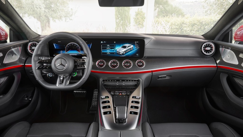 There isn’t much to visually distinguish the new GT 63 S E Performance from the regular GT 63 S. It has a slightly different front bumper that looks more like the AMG GT sports car with the outer air intakes wider and vertical slats. Around the rear, its bumper now has a flap for the electric drive unit’s charging port. It gets the same pair of externally fluted trapezoidal twin exhaust pipes as the non-hybrid GT 63 S. There’s also an E Performance badge on the front fenders under the iconic V8 Biturbo badging.