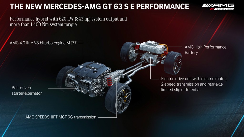 The motor is powered by a 6.1kWh high-performance battery that is capable of containing high power density, deploying it quickly, and fast energy regeneration. This electric drive unit is all about performance to deliver extra power and torque on demand, repeatedly. It’s light too at just 89kg, considering the amount of performance it can offer. In pure EV mode, the GT 63 S E-Perf can only manage 12km of range which is just enough to get in and out of a residential area where Affalterbach’s monstrous V8 would be too much to handle.