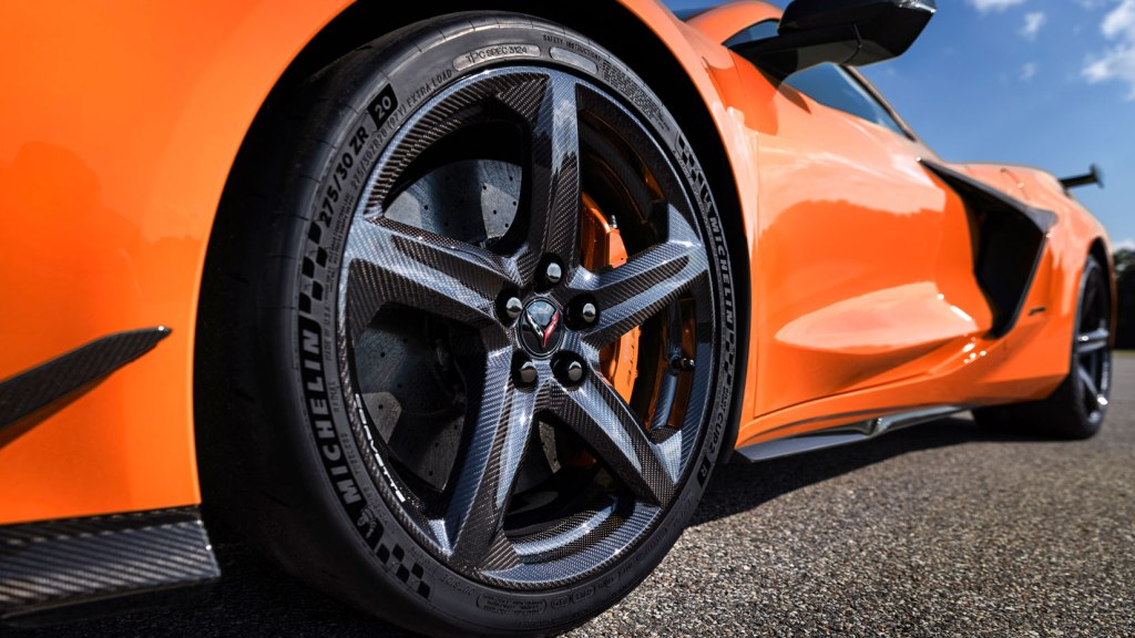 As part of the Z07 package, you get a large, fixed, carbon-fibre rear wing derived from the C8.R racecar that provides 333kg of downforce at 300kph. You also get more aggressive chassis tuning, front canards, larger front splitter, ground effect aero, recalibrated Magnetic Ride Control 4.0 suspension, Brembo carbon-ceramic brakes, and Michelin Cup 2 R ZP tyres. The Z06 already offers some weight-saving by using more carbon fibre but you can further shave 18.6kgs off the kerb weight with the optional carbon fibre wheels.
